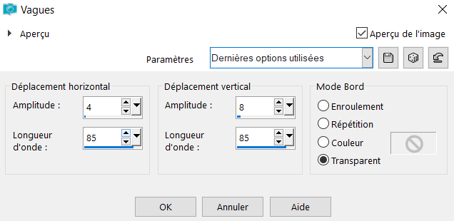 8° Effets - Effets de distortion vagues avec les paramètres suivants :