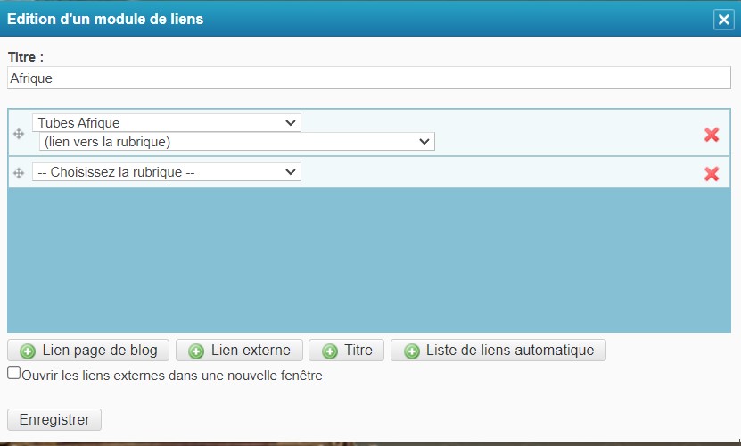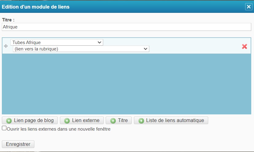 A gauche de l'écran vous avez les titres des rubriques déjà créées (Rubrique d'articles, livre d'or...)